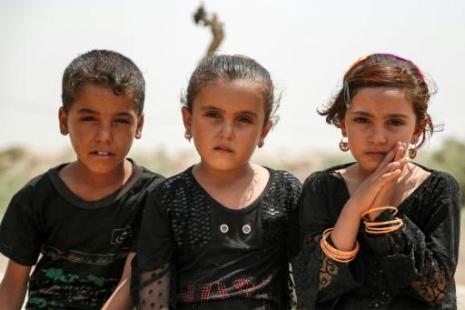 ثلاثة من أطفال العراقي ناجح فرحان السبعة في صورة ملتقطة في باحة منزلهم في قرية الزوية في جنوب العراق في التاسع من آب/أغسطس 2023 afp_tickers