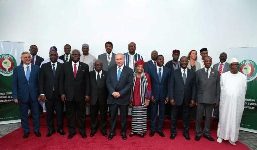 صورة لرئيس الوزراء الاسرائيلي بنيامين نتانياهو مع رؤساء عدة دول افريقية خلال قمة اقتصادية لقادة دول غرب أفريقيا في ليبريا في 5 حزيران/يونيو 2017. afp_tickers