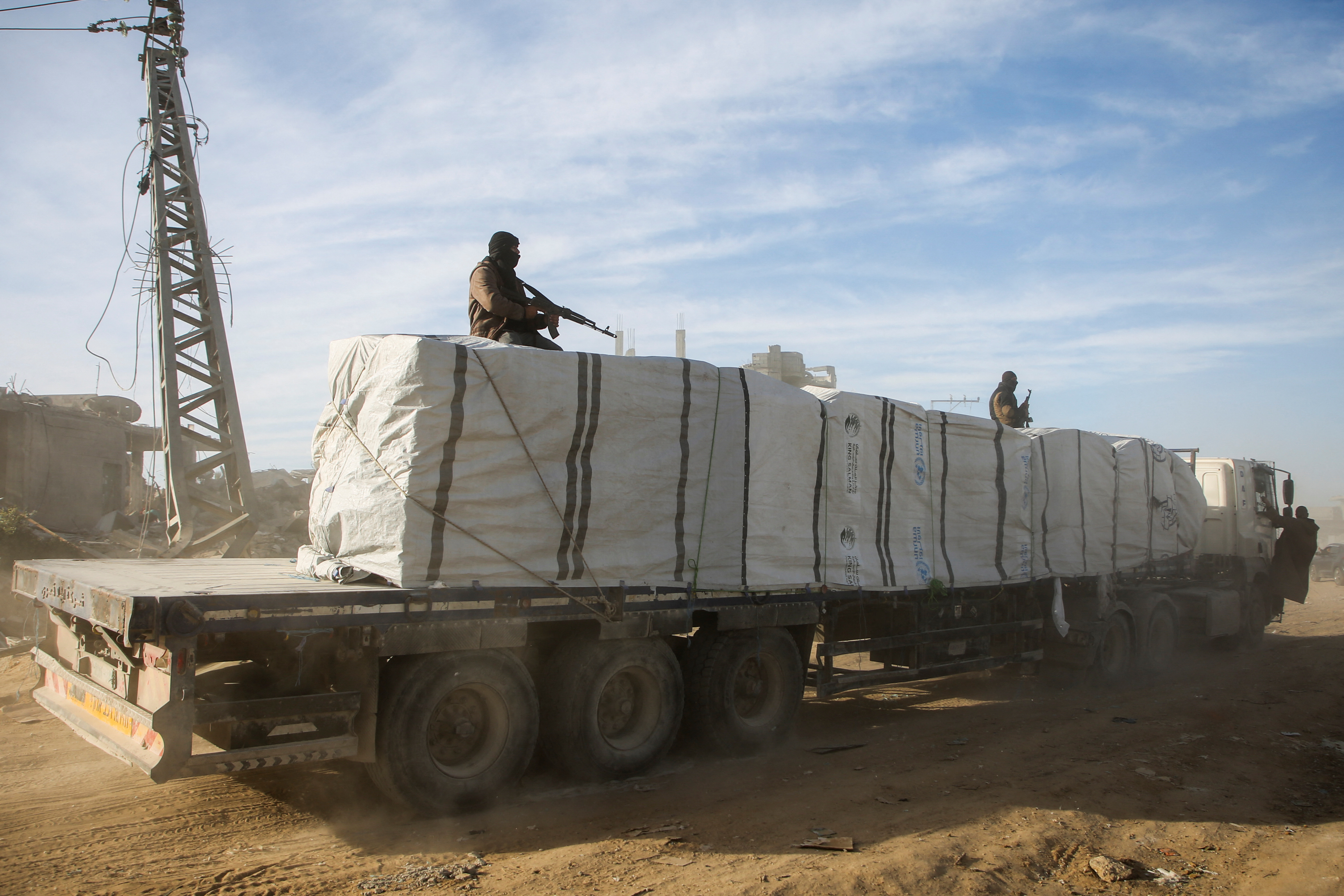 ودخلت الشاحنات في اليوم الأول من اتفاق وقف إطلاق النار بين إسرائيل وحركة المقاومة الإسلامية الفلسطينية (حماس).