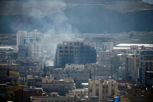 تصاعد الدخان خلف مبنى في صنعاء في 3 كانون الأول/ديسمبر، 2017 خلال مواجهات بين الحوثيين وقوات موالية للرئيس السابق علي عبدالله صالح afp_tickers