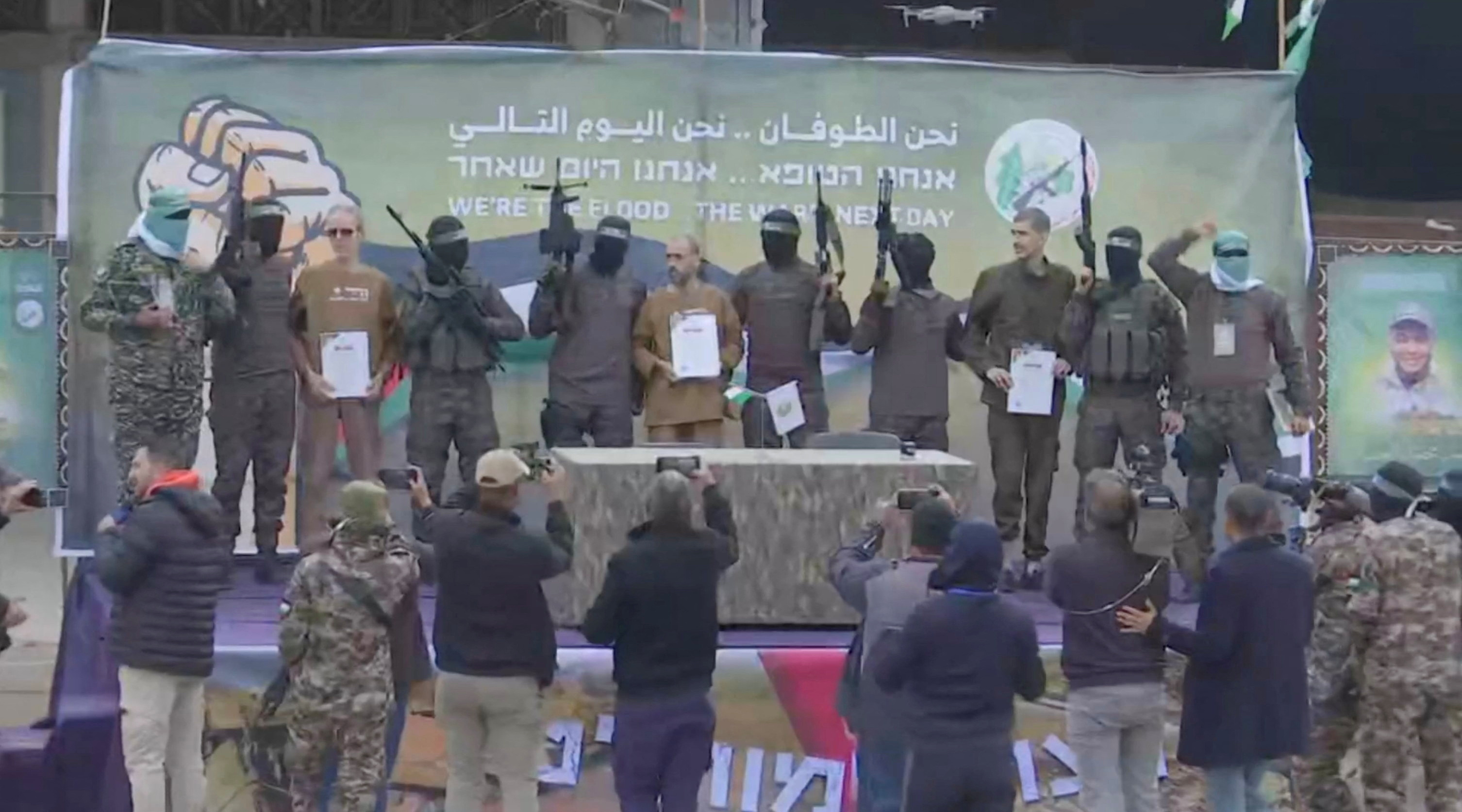حماس تسلم ثلاثة رهائن إسرائيليين للصليب الأحمر في دير البلح بغزة