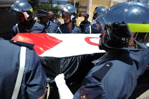 وادى مقاتلون في البوليساريو التحية للنعش الذي نقلته سيارة رباعية الدفع ولف بعلم “الجمهورية العربية الصحراوية الديموقراطية” التي اعلنتها الجبهة الانفصالية العام 1976 من دون ان تعترف بها الامم المتحدة.