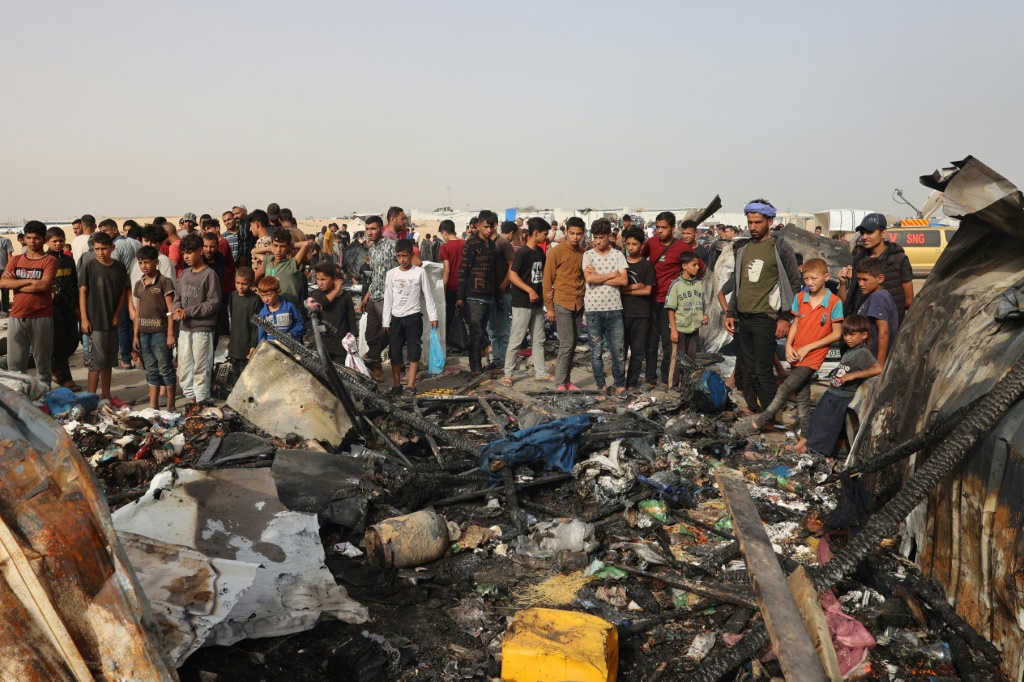 في مخيم النازحين في رفح الذي تعرّض لقصف إسرائيلي الليلة الماضية، كان فلسطينيون ينظرون بصدمة الى بيوت الصفيح المتفحمة، والدمار وآثار الدماء الناتجة عن حريق اندلع بعد الغارة.