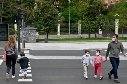 وأفادت العائلات الإسبانيّة من قواعد جديدة تُتيح للأطفال الخروج للمرّة الأولى منذ 14 آذار/مارس، وشوهد أطفال يلهون على درّاجات هوائية في شوارع مدريد وارتدى بعضهم أقنعة وقفازات.