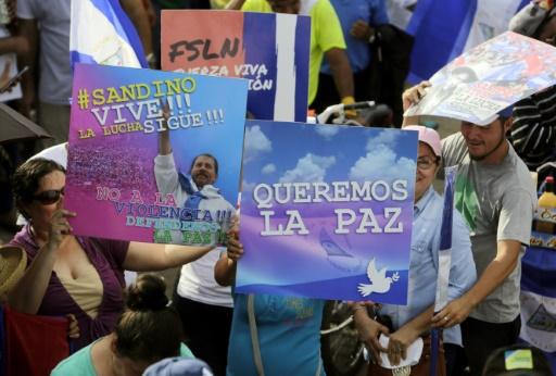 مؤيدون لرئيس نيكاراغوا دانيال اورتيغا يحملون في ماناغوا في 30 ايار/مايو 2018 ملصقات كتب عليها "نريد السلام" و"النضال مستمر". afp_tickers