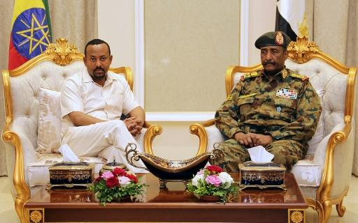رئيس الوزراء الإثيوبي آبي أحمد (يسار) خلال لقائه رئيس المجلس العسكري السوداني الحاكم الفريق أول ركن عبد الفتاح البرهان في الخرطوم بتاريخ 7 حزيران/يونيو 2019 afp_tickers