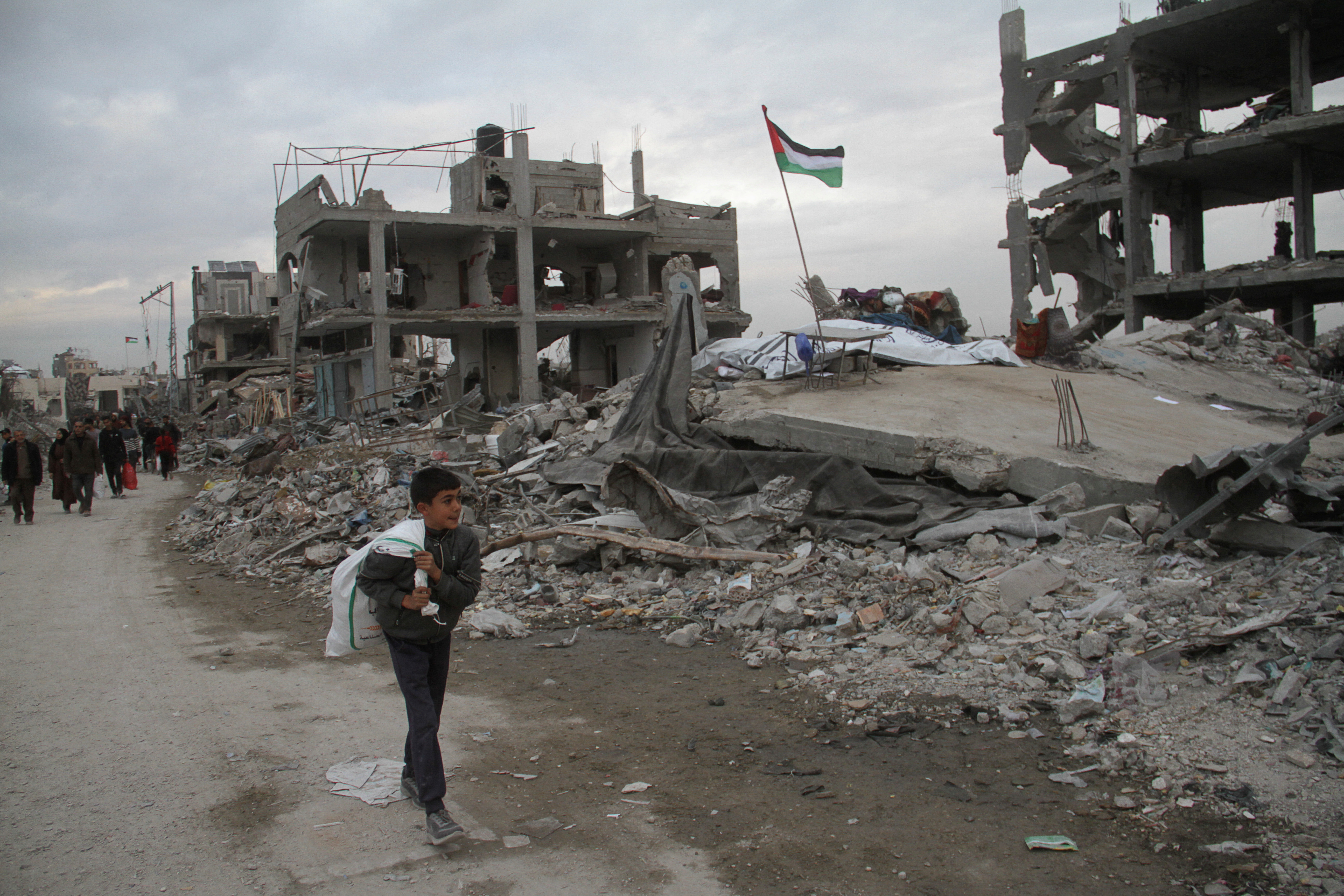 وفي منطقة مفتوحة محيطة ببنايات تم تفجيرها، بدأت مجموعة من الرجال في نصب خيام بيضاء في صفوف لتستقبل الأسر التي تعتزم العودة للشمال يوم السبت عندما تفرج حركة حماس عن المجموعة الثانية من الرهائن مقابل إطلاق سراح العشرات من الفلسطينيين من السجون الإسرائيلية.