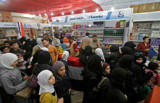 قبل بدء شهر رمضان، يتدافع العشرات على مدخل سوق مؤقت في مدينة دوما قرب دمشق، يبحثون عن بضائع من مواد غذائية وتنظيف إلى ألعاب أطفال بأسعار منخفضة لم يعتادوا عليها طوال سنوات حصار معقل الفصائل المعارضة السابق.