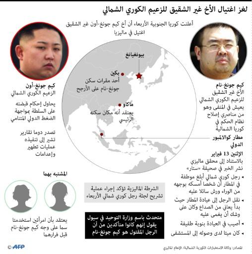 ويعكف المختصون في كوالالمبور على فحص جثة كيم جونغ-نام الذي قتل الاثنين في مطار عاصمة ماليزيا الدولي، للتوصل الى ادلة حول الطريقة التي قتل فيها، فيما قال مدير الاستخبارات في كوريا الجنوبية امام البرلمان انه “يشتبه بقوة” ان يكون السبب التسمم.