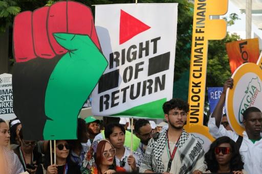 وكان بالإمكان رؤية لافتات تدعو إلى “وقف الاستعمار المناخي” و”إنهاء استخدام الوقود الأحفوري” إلى جانب أخرى كُتب عليها “وقف إطلاق النار الآن” و”إعادة الأرض” و”حقّ العودة” وقد زُينت بألوان العلم الفلسطيني، علمًا أن الأمم المتحدة تمنع رفع الأعلام أو ترداد اسم دولة معيّنة خلال التظاهرات المناخية.