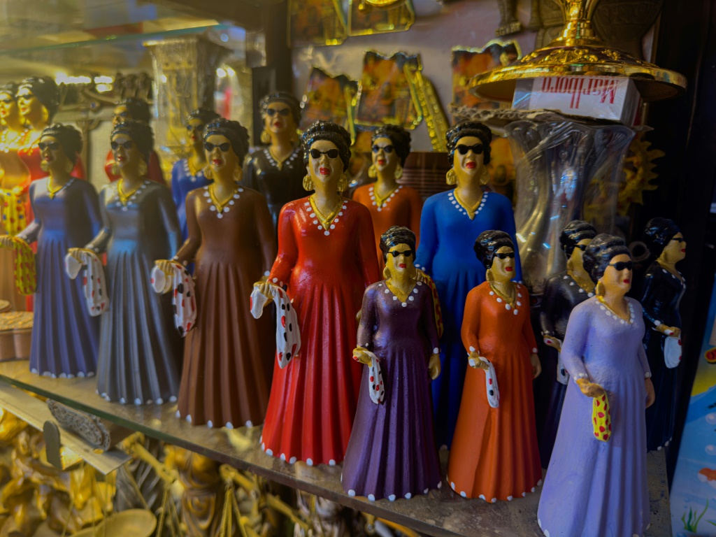 خارج المقهى، يعرض البائع شادي سعيد تماثيل صغيرة لأم كلثوم مرتدية وشاحها المميز ونظاراتها الشمسية مع فرقتها الموسيقية، وقد صُممت كل قطعة بعناية فائقة. فالموسيقيون يرتدون بزّات أنيقة ويحملون آلات تقليدية مثل القانون والعود.