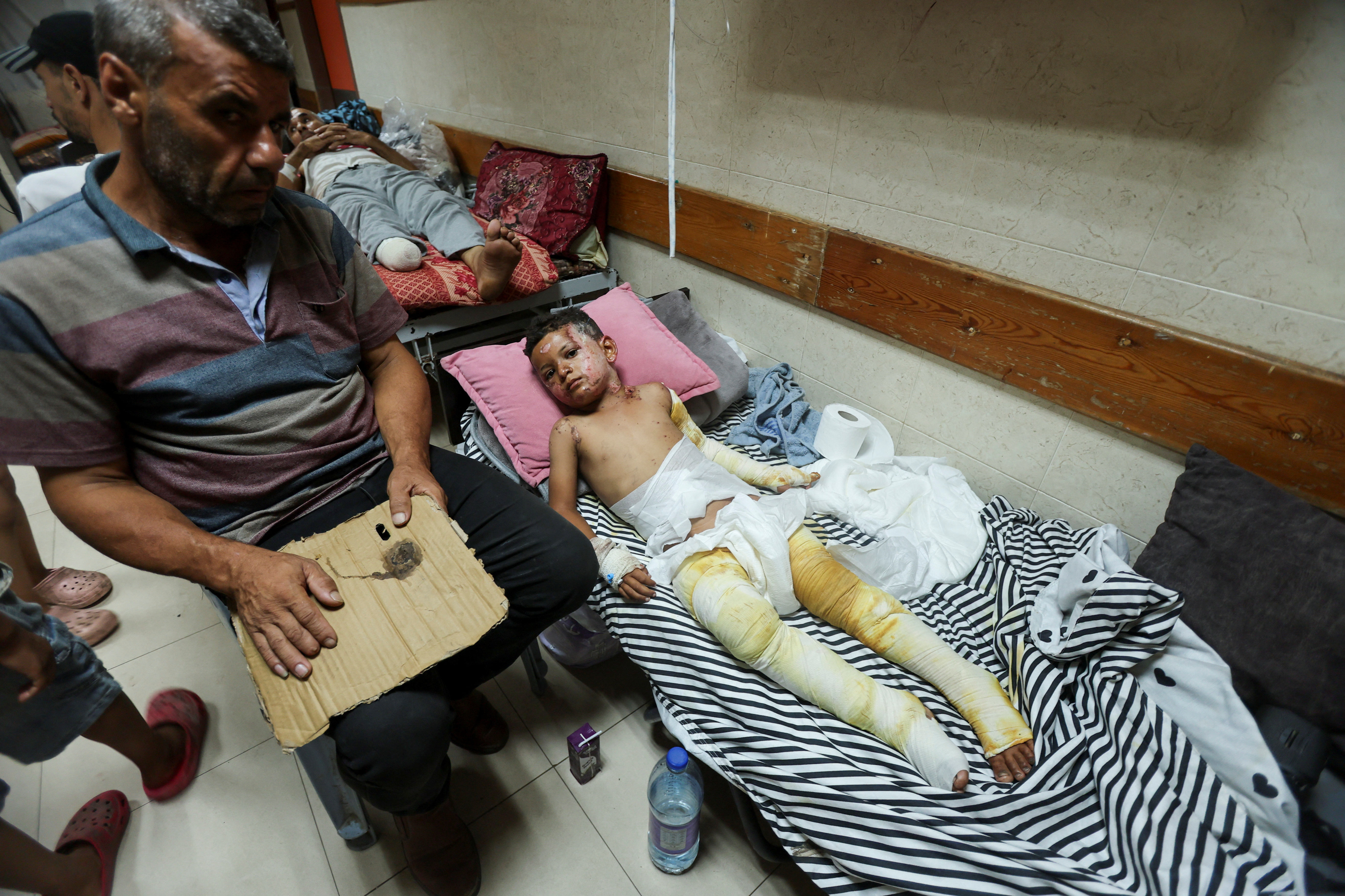 وفي وقت لاحق، جلس الصبي في السرير على وسادة وردية، وبدا عليه الألم بينما كان والده يدفع بالهواء نحو جروح الطفل بقطعة من الورق المقوى أملا في تبريدها.