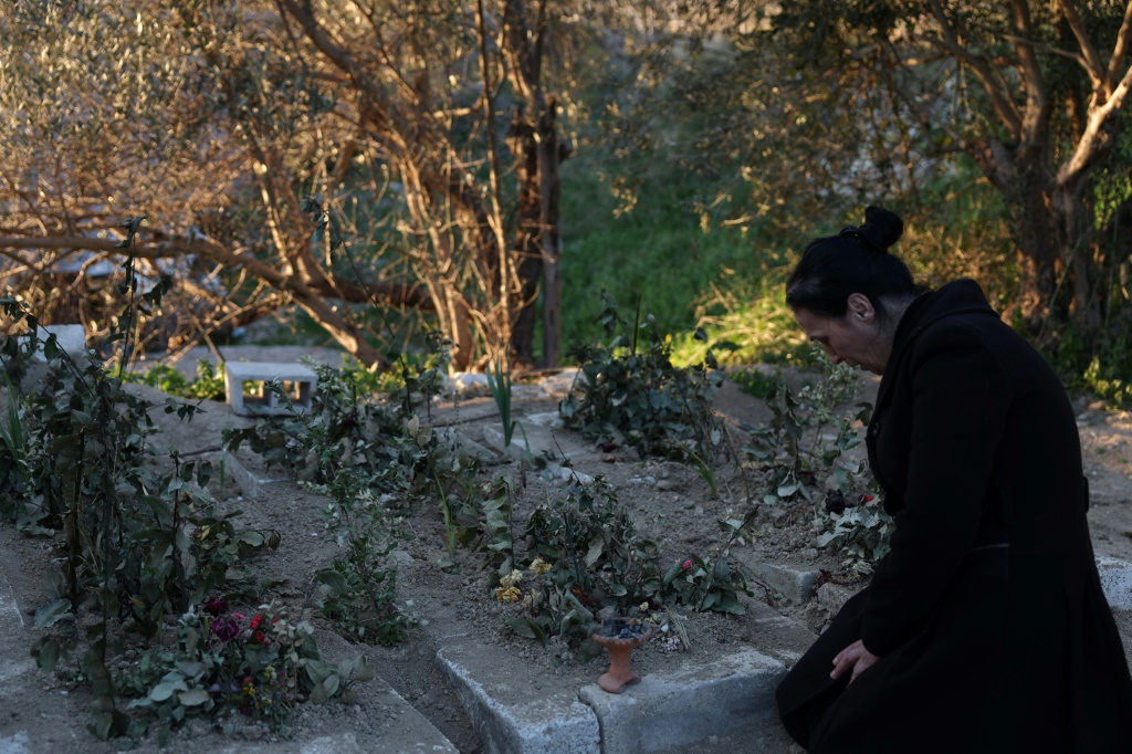 جثت نسرين عز الدين بأسى في جوار ثلاثة قبور في حديقة منزلها رصفت حولها الحجارة ووضع عليها بخور وورود ذابلة، وفيها يرقد ابنها وزوجها وابن شقيقته الذين قتلهم مسلحون “أجانب” في منطقة يقطنها علويون في غرب سوريا.