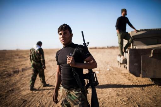 ينتشر مقاتلون من قوات الحشد الشعبي على الخطوط الامامية للجبهة على بعد اربعة كيلومترات من بلدة تلعفر الاستراتيجية التي ما زالت تحت سيطرة تنظيم الدولة الاسلامية، في وقت يسمع صوت إطلاق رصاص القناصة وتساقط قذائف هاون على مقربة من المكان.