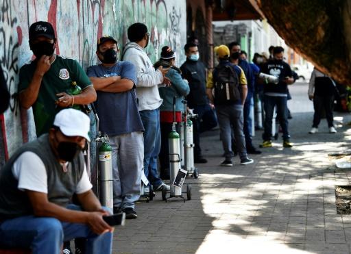 في أحد شوارع غرب مكسيكو، يصطف العشرات لشراء الأوكسجين لأقربائهم المصابين بكوفيد-19، وينتظرون أحياناً لخمس ساعات ليحصلوا على العبوة التي لا تدوم أكثر من ساعة في بعض الأحيان.