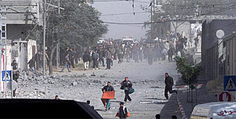 رجال اغاثة ومدنيون فلسطينيون يحاولون النجاة من قصف مكثف شنته الطائرات الحربية الاسرائيلية على شمال مدينة غزة يوم الثلاثاء الماضي Keystone