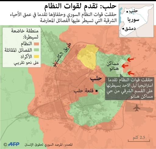 وبدأت قوات النظام هجوما بريا على احياء حلب الشرقية في 22 ايلول/سبتمبر الماضي، توقف اثر اعلان روسية هدنتين متتاليتين من جانب واحد.