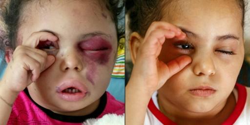 وظهرت بثينة في إحدى الصور يحملها رجل يهرول بها وسط حطام منزلها، قبل أن تظهر مجددا في مستشفى، بعينيها المتورمتين، وقميصها الزهري.