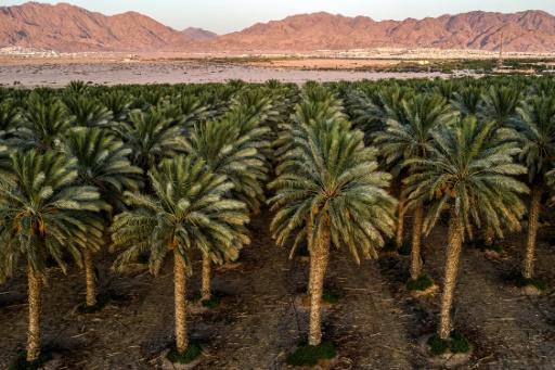 تحت أشعة شمس حارقة، يضبط مزارع إسرائيلي خرطوم ري التفّ حول شجرة نخيل الى شمال مدينة إيلات الساحلية بين البحر الأحمر والصحراء، ويخرج منه مزيج من مياه جوفية ومياه صرف صحي معاد تدويرها في محطة معالجة مياه صرف صحي محلية.