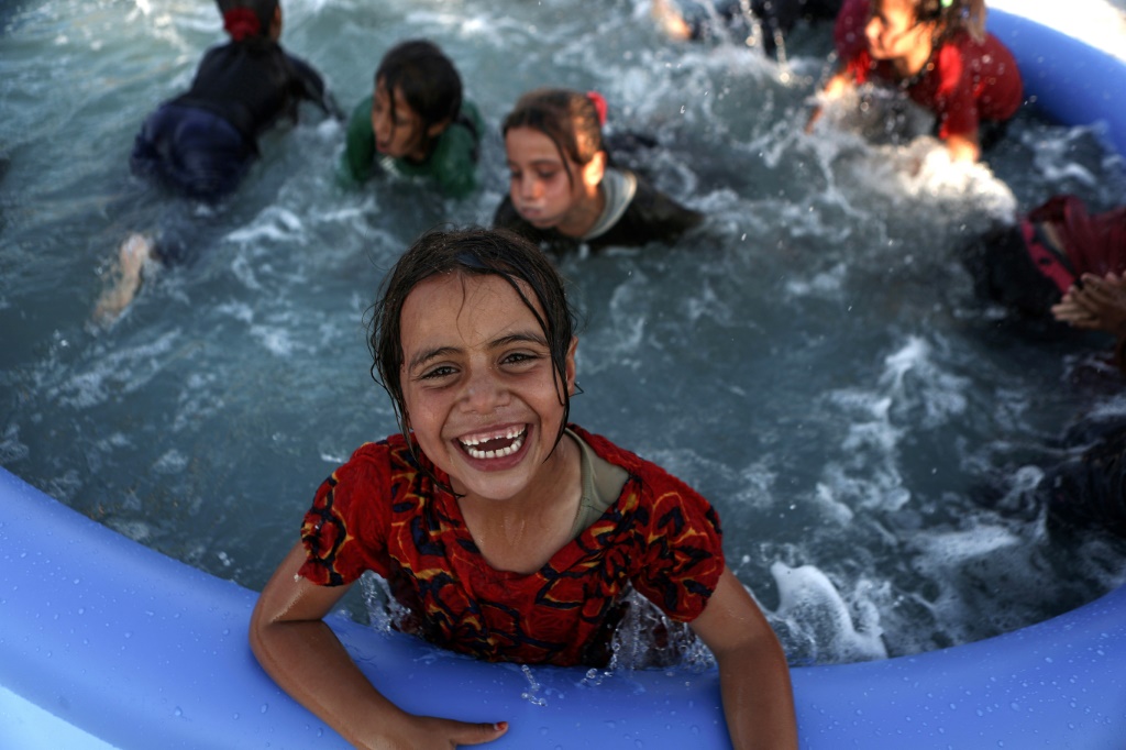 وسط مخيم في شمال سوريا، تعلو قهقهات أطفال يقفزون داخل أحواض سباحة أحضرها متطوعون محليون، في محاولة للتخفيف من حدّة الحر ورسم الفرح على وجوه صغار نشأوا أو وُلدوا خلال سنوات الحرب.