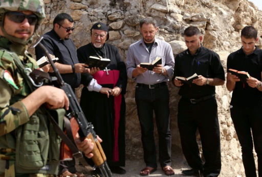تجمع رجال دين مسيحيون عراقيون للصلاة الخميس في جوار دير قديم يطل على سهل نينوى في الذكرى الاولى لتهجيرهم من هذه المنطقة بيد تنظيم الدولة الاسلامية المتطرف، آملين بعودة قريبة اليها.