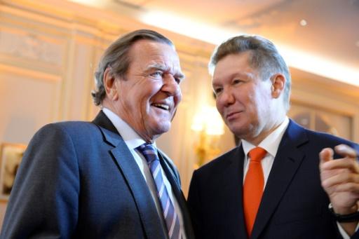 رئيس شركة غازبروم الروسية الكسي ميلر (يمين) ورئيس المجلس المشرف عل نورد ستريم 2 المستشار الألماني السابق غيرهارد شرودر (يسار) خلال التوقيع على اتفاق خط انابيب غاز نورد ستريم 2 في باريس يوم 24 نيسان/أبريل 2017 afp_tickers