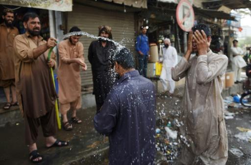 عمال باكستانيون يرشون انفسهم بالماء وسط موجة الحر في كراتشي afp_tickers