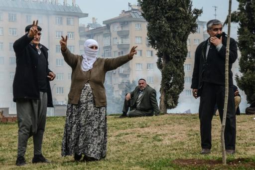 متظاهرون اكراد يرفعون شارات النصر في دياربكر اثناء تفريق الشرطة التركية لهم بالغاز المسيل للدموع في 27 شباط/فبراير 2016 afp_tickers