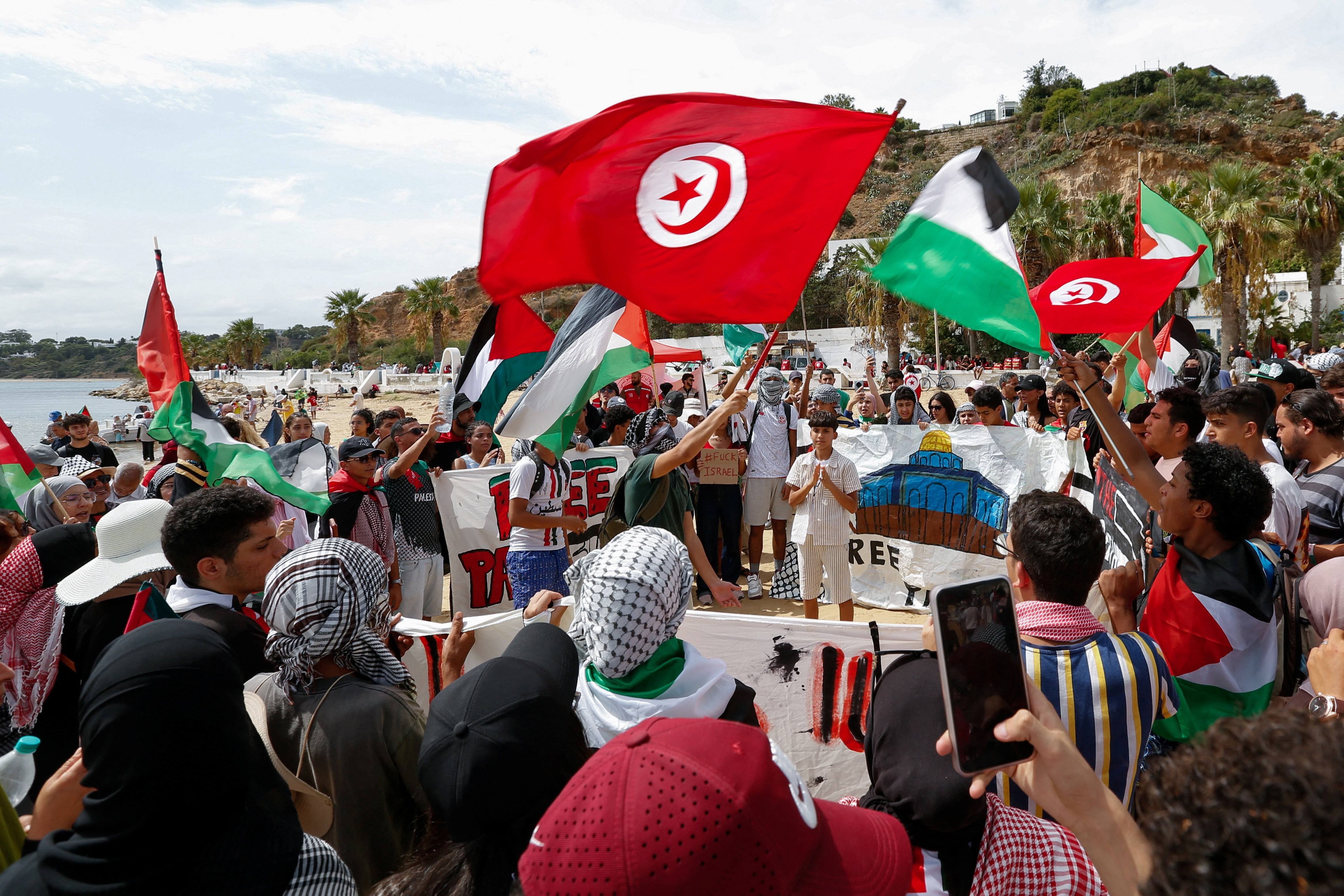 وتجمع الآلاف على شاطئ سيدي بوسعيد وهم يلوحون بالعلم الفلسطيني ويرددون هتافات تنادي بالحرية لغزة وتندد بإسرائيل والولايات المتحدة.