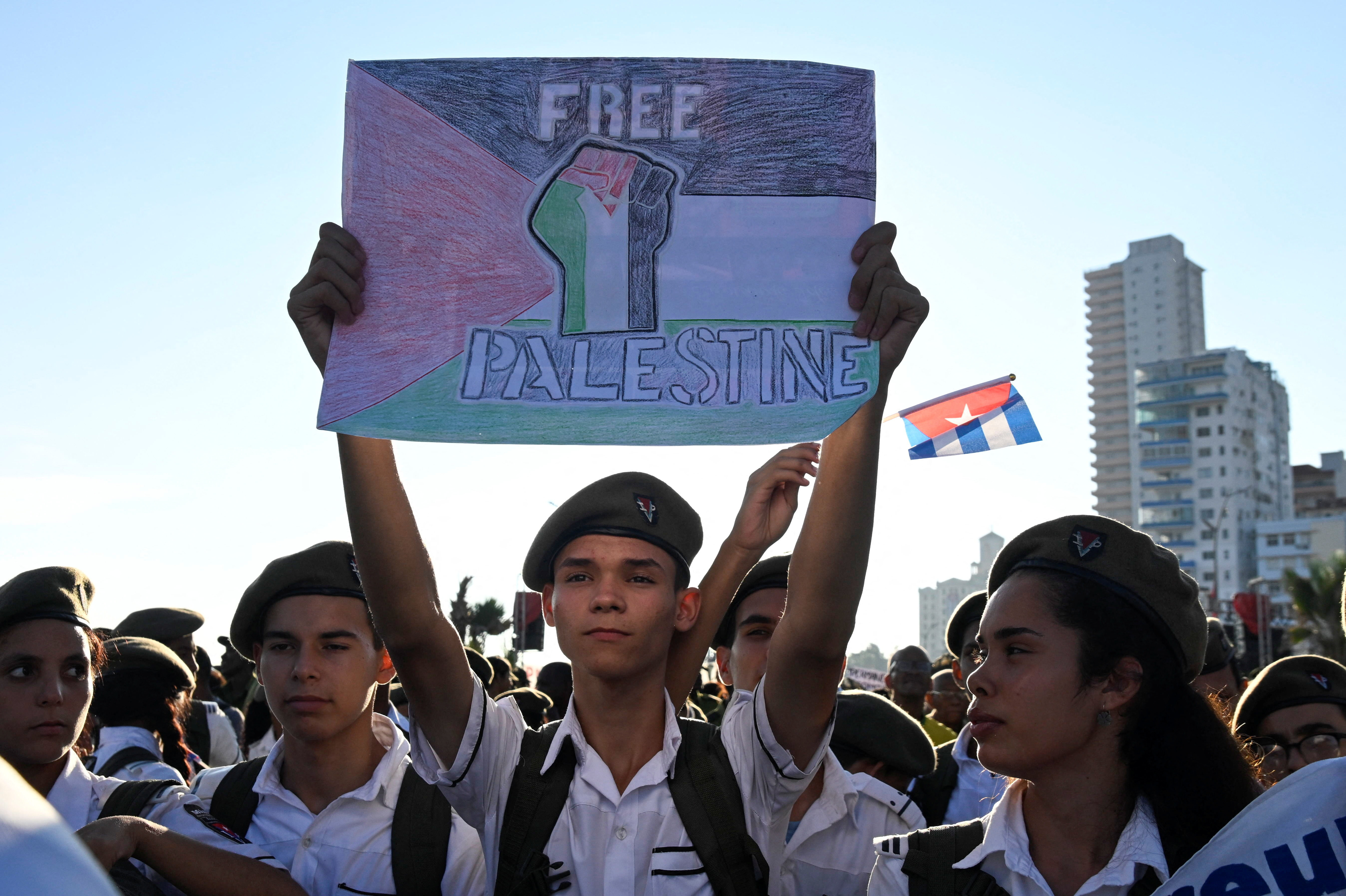 ولوح الكوبيون بالأعلام الفلسطينية وهتفوا من أجل السلام، ونددوا بواشنطن لتقديمها الأسلحة والدعم الدبلوماسي لحليفتها إسرائيل خلال الصراع. وقال الكثيرون إنهم يشككون في الاتفاق الذي توسط فيه الرئيس الأمريكي دونالد ترامب.