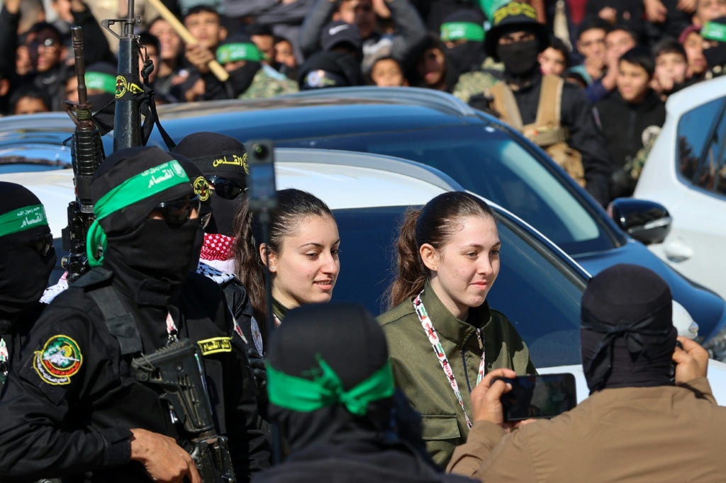 وقبل الإفراج عن الإسرائيليات الأربع السبت، وصل عشرات من مقاتلي حماس والجهاد الإسلامي الملثمين بكامل لباسهم العسكري إلى ميدان فلسطين في المدينة. وكانوا يحملون بنادق وقاذفات صواريخ. واحتشد حولهم الآلاف من سكان غزة ملوّحين بالعلم الفلسطيني.
