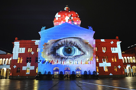 بعد أكثر من 30 شهرا من أشغال التجديد والصيانة التي زادت قيمتها عن 100 مليون فرنك، أعيد يوم الجمعة 21 نوفمبر افتتاح القصر الفدرالي الذي يضم مبنى البرلمان والحكومة الفدرالية وسط العاصمة برن وسط احتفالات شعبية تتواصل إلى يوم الأحد. وفي هذه المناسبة، أضاء الفنان جيري هوفستيتر الواجهة الشمالية للمبنى بإبداعاته الطريفة. (KEYSTONE/Marcel Bieri)