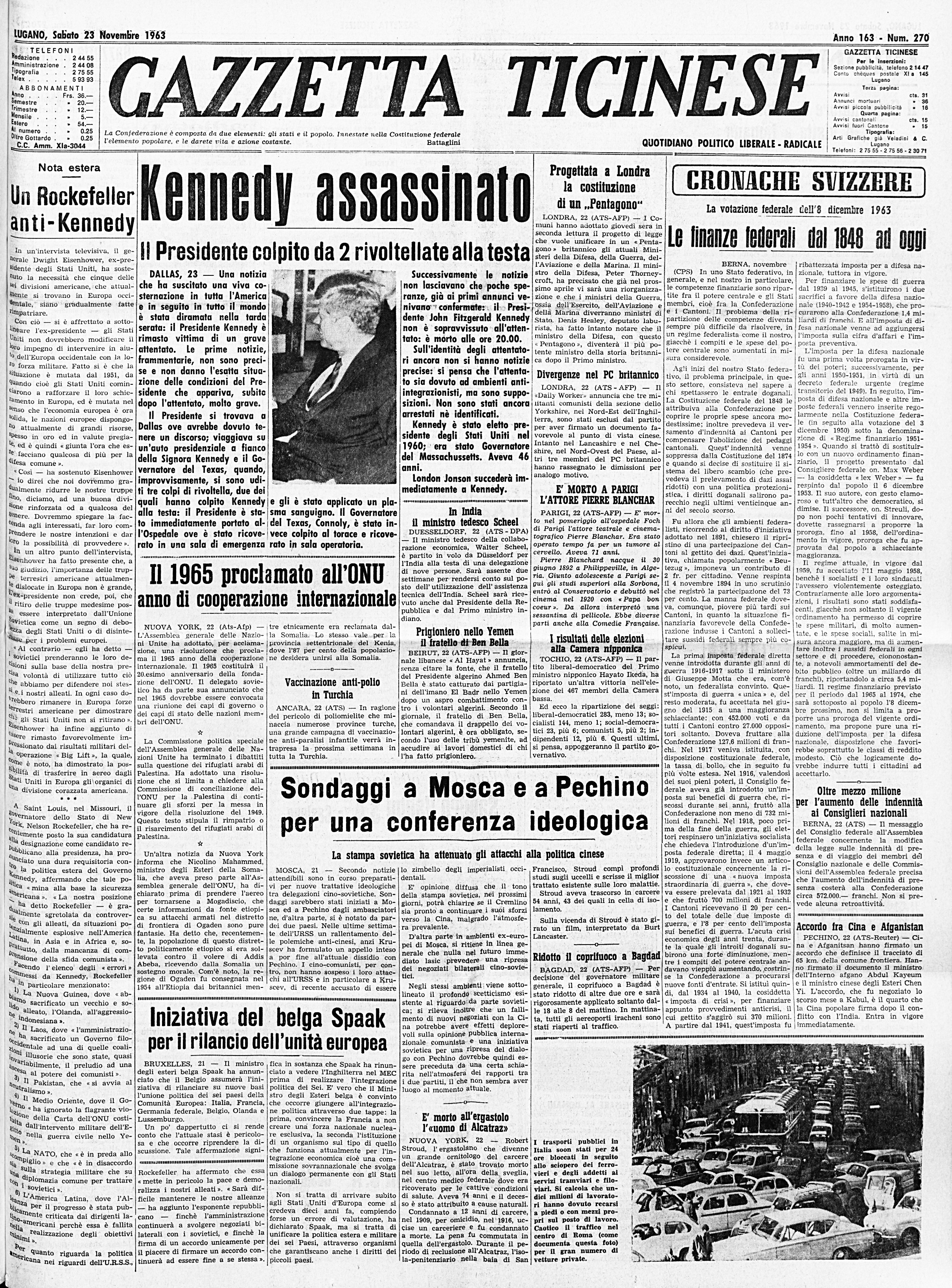أغتيل كنيدي يوم الجمعة 22 نوفمبر 1963، على الساعة السادسة والنصف مساءً بحسب التوقيت السويسري. وهو ما اضطرّ معظم الصحف السويسرية إلى انتظار صباح اليوم الموالي لتغطية الحادثة من خلال طبعات عطلة نهاية الأسبوع.