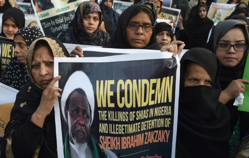 باكستانيون شيعة يرفعون صور زعيم الحركة الاسلامية لنيجيريا ابراهيم زكزكي خلال تظاهرة للتنديد بقتل شيعة في باكستان ونيجيريا، في 18 كانون الاول/ديسمبر 2015 afp_tickers
