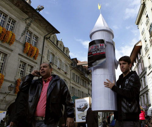 ناشطون في لجنة تحمل اسم “حرية دينية” تضم في صفوفها نائب رئيس التنظيم الشبابي للحزب الليبرالي الراديكالي يرفعون مجسما لمئذنة بارتفاع مترين ويوزعون مناشير على العابرين خلال مسيرة نظمت يوم السبت 14 نوفمبر 2009 في سوق La Palud وسط مدينة لوزان. ( Keystone/Jean-Christophe Bott)