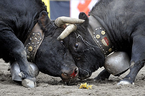 من اليمين “سلطانة”، نجمة من نجوم عالم البقر، تصارع “مانهاتن”. هذه المبارزة بين ممثلتين عن سلالة “Hérens” دارت يوم 10 مايو في أبروز (Aproz) بكانتون فالي. (KEYSTONE/Dominic Favre)