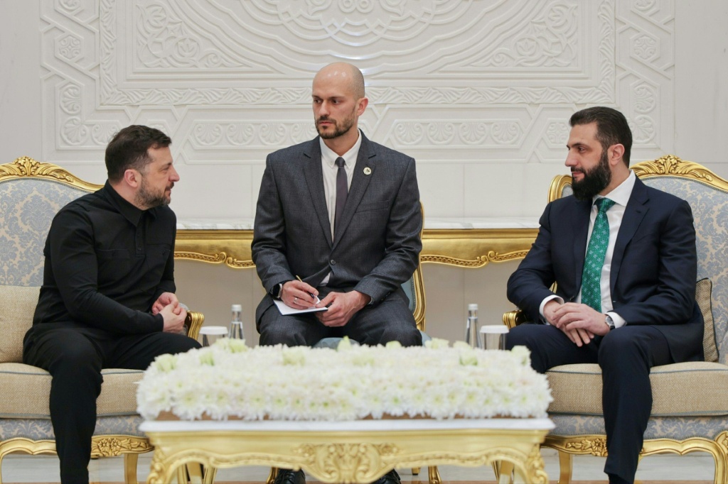 التقى الرئيس الأوكراني فولوديمير زيلينسكي نظيره السوري أحمد الشرع، خلال زيارة لدمشق الأحد رفقة وزير الخارجية التركي هاكان فيدان، لإجراء محادثات تتركز خصوصا على الوضع الإقليمي والحرب مع روسيا.