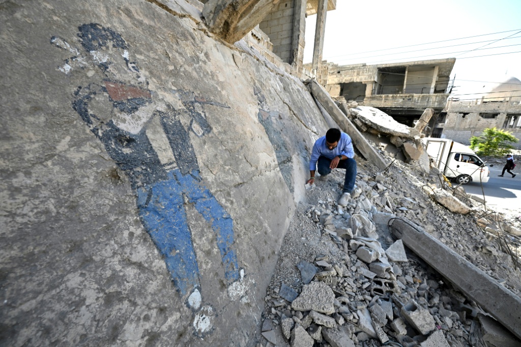 في المدينة الوحيدة التي أخلاها الحكم السابق تماما من سكانها في ذروة سنوات النزاع السوري، يتفقد شوربه (31 عاما) إحدى رسوماته على جدار مهدّم في أحد الأحياء. تجسّد “سمفونية الثورة” كما أسماها، كيف تحوّلت التحركات السلمية الى نزاع مسلح تعدّدت أطرافه. وتظهر في الرسم فتاة برداء أبيض تعزف الكمان، وخلفها جندي يصوّب بندقيته تجاهها، ومن خلفه مقاتل يلاحقه ويقع بدوره تحت مرمى بندقية مقاتل من تنظيم الدولة الإسلامية.
