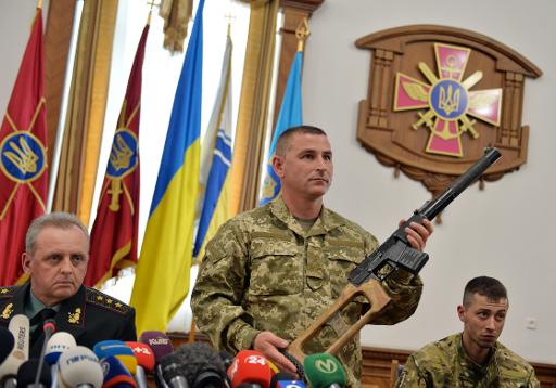 ضابط اوكرانيا يعرض بندقية قال انها ضبطت مع جنديين روسيين اسرا في الشرق، في مؤتمر صحافي الثلاثاء 19 ايار/مايو 2015 في كييف afp_tickers