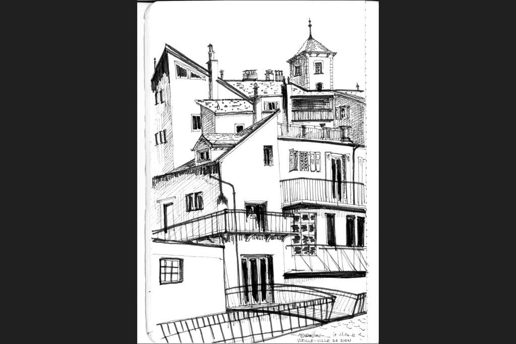 فوفي، Vevey سبتمبر 2006، مشهد مُتصوّر من محض الخيال، ومستوحى من أشكال الهندسة المعمارية القديمة. وقد تعلمت الرسامة هذه التقنية على يد أستاذها في المدرسة.