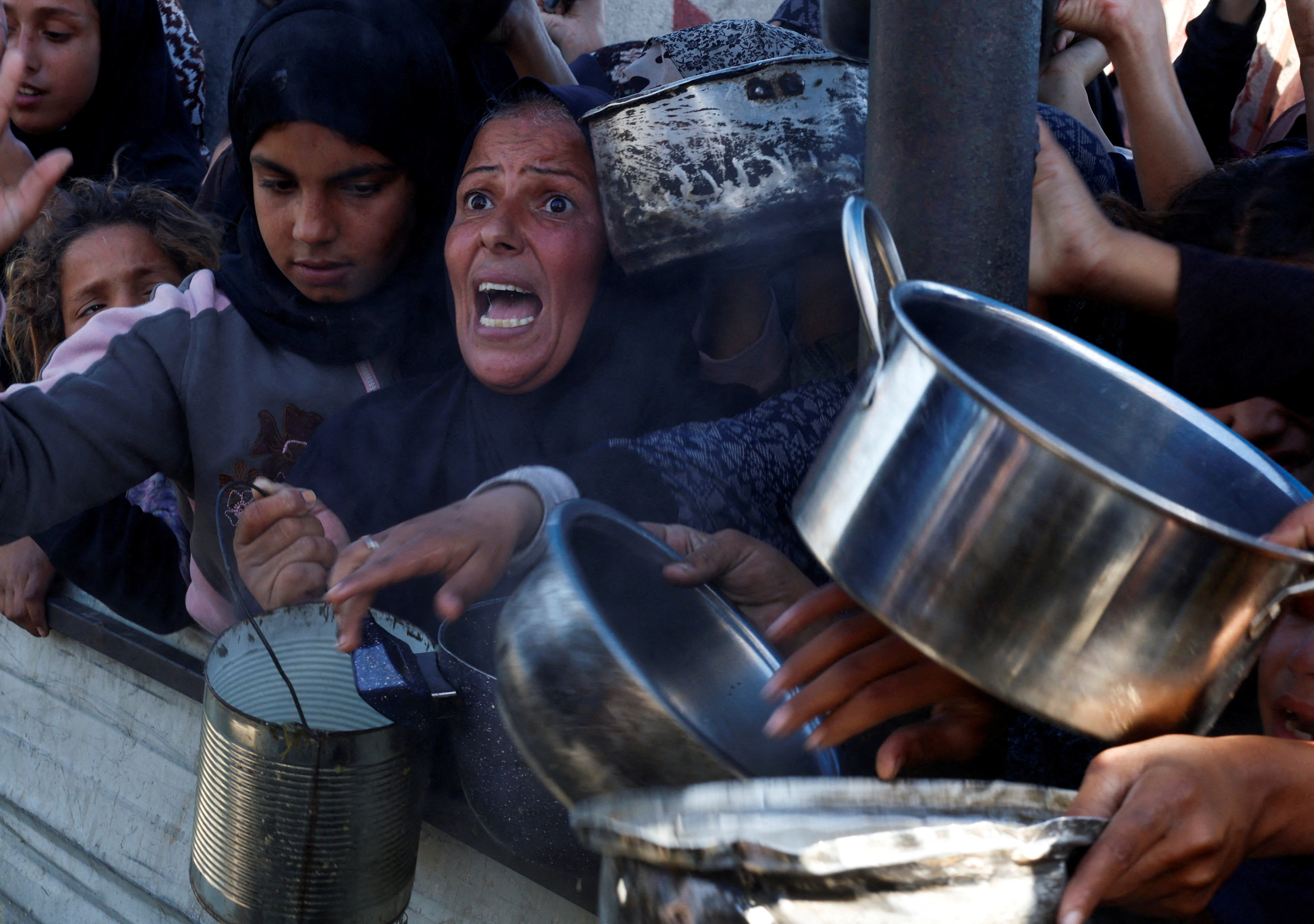 وإلى الشمال، في النصيرات، اصطف مئات الفلسطينيين في طوابير للحصول على أرز مطبوخ ساخن في مطبخ طوارئ مفتوح. واصطف الأطفال الصغار في مقدمة الطوابير يلوحون بالأواني التي جاءوا ليحصلوا فيها على أي شيء تقتات عليه عائلاتهم.