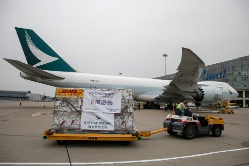لقاحات فايزر/بايونتيك تنقل في مطار هونغ كونغ الدولي في 27 شباط/فبراير 2021. afp_tickers