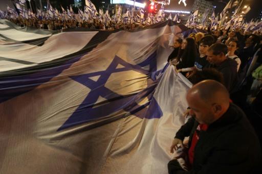 متظاهرون يرفعون علما إسرائيليا كبيرا خلال احتجاج على إصلاح النظام القضائي، في تل أبيب في 29 نيسان/أبريل 2023 afp_tickers