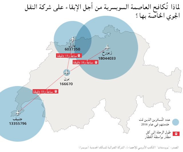 منافسة حادة من زيورخ وبازل وجنيف: تنشط شركتا “إيزي جيت” و”ريان -آر” على مستوى المطارات السويسرية الثلاث الكبرى، والتي لا تفصلها على برن سوى ساعتيْن على متن القطار في أقصاه. (أنظر الرسم المرافق). صحيح أن تدابير التسجيل والمراقبة الأمنية في مطار برن هي مريحة جدا مقارنة بالمطارات الكبرى، ولكن توفّر رحلات منتظمة ومتناسقة على متن القطارات والحافلات من شانه أن يذلّل الفارق.