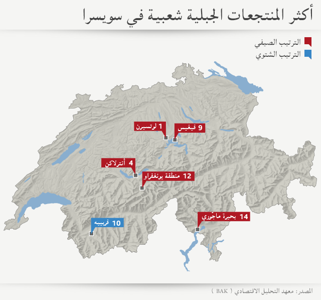 احتلت خمس منتجعات سويسرية أحد المراتب الـ 15 الأوائل لإحصائية الصيف: لوتسيرن (1)، انترلاكن (4)، فيغيس (9)، ومنطقة يونغفراو (12) وبحيرة ماجوري والوديان المحيطة بها (14).