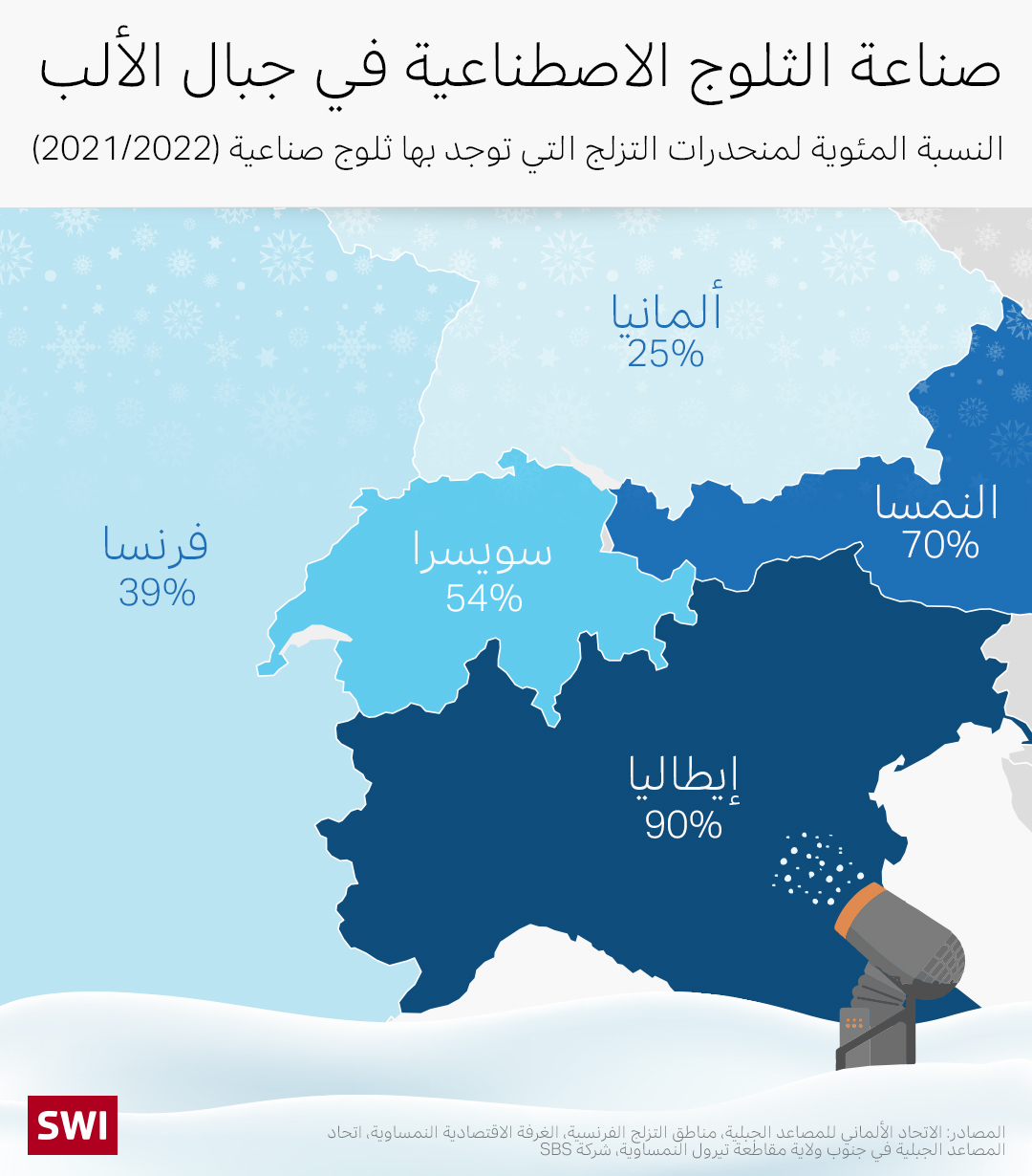 من جهة أخرى، تعتبر الجمعية السويسرية لمصاعد التزلج أن استخدام مدافع صناعة الثلج أمر ضروري لتجهيز منحدرات التزلج. كما أن استخدامها يضمن توفر طبقة أساس ثلجية للراغبين في التزلج في فترة ما قبل عيد الميلاد، وبالتالي فهي تساهم في تحقيق الإيرادات السنوية للسياحة الشتوية في سويسرا، والبالغة خمس مليارات فرنك (5.65 مليار دولار).
