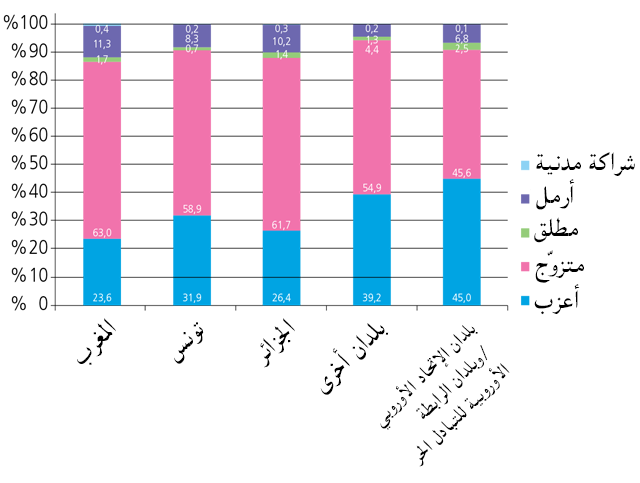 ومن خلال إلقاء نظرة على محددات الحالة المدنية لهؤلاء الرعايا، نخلص إلى الملاحظات التالية: نسبة عالية جدا من سكان هذه البلدان الثلاث متزوّجون (ثلثا المغاربة والجزائريين متزوّجون/ مقابل 59% بالنسبة للتونسيين)، مما يشير إلى أن غالبية هؤلاء المهاجرين مستقرّون نسبيا، ويعيشون ضمن إطار أسري، أما نسبة العزوبة فهي تتراوح بين 24% لدى المغاربة و32% لدى التونسيين.
