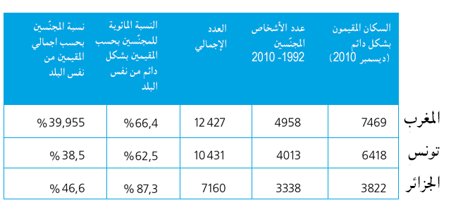 واجمالا، يمكن القول إن المغاربة يمثلون النسبة الاعلى من الذين هم في عمر النشاط والعمل، والجزائريين النسبة الأعلى بالنسبة للأشخاص المتقدمين في العمر، والتونسيون النسبة الاعلى من حيث عدد الشباب.