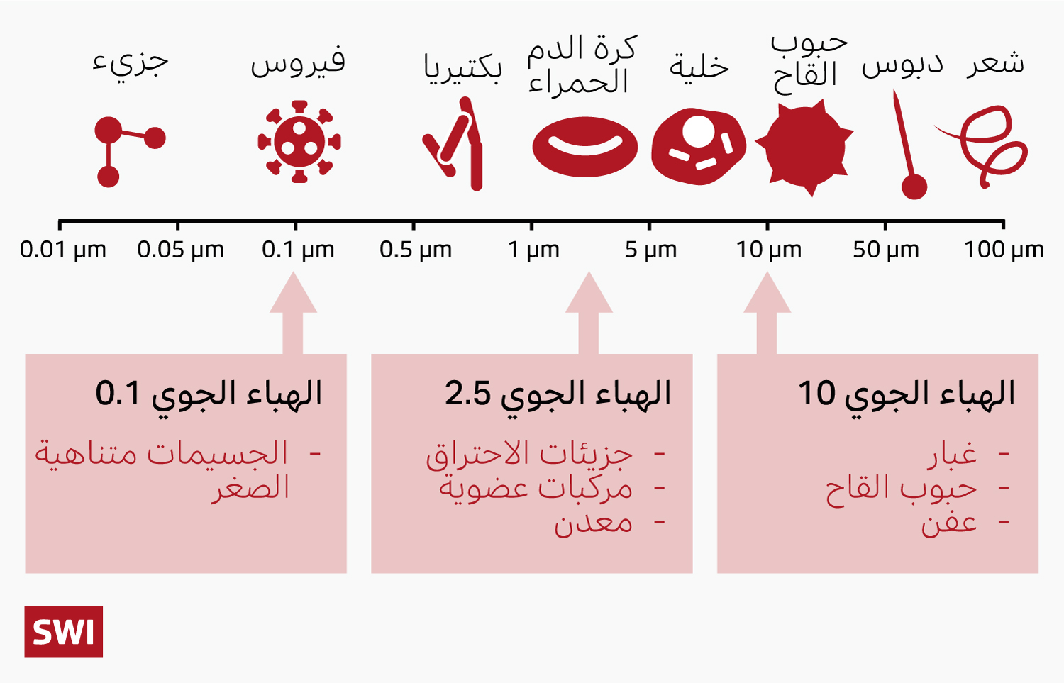 تُظهر الصورة أسفله تبايناً حاداً بين قطر جسيمات الهباء الجوي من ناحية، وبين حجم الجسيمات الأخرى المختلفة، وقطر الطلع أو حبوب اللقاح ورأس الإبرة والشعرة من ناحية أخرى. ويرمز إلى الجسيمات المعلّقة أو ما يعرف بالهباء الجوّي بحرفيْ PM، وهو اختصار “Particulate Matter”. وتمثل القيمة بعد “PM” حجم قطر الجسيم، الذي يقاس عموماً بالميكرونات. وكلما زادت القيمة، زاد حجم الجسيم.