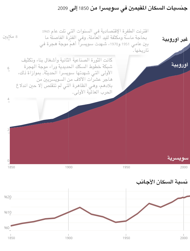 في العام المنقضي، بلغ عدد المهاجرين 73.000 شخص، وهم رقم أدنى بقليل من السنوات الست السابقة. وهؤلاء الأجانب الذين قدموا إلى سويسرا للإقامة أو للبحث عن عمل هم بالأساس من أصحاب المهارات والكفاءات، وينتمون (هم وعائلاتهم) إلى بلدان الإقتصاديات الأوروبية التي ضربتها أزمة إقتصادية مستحكمة منذ عدة سنوات.